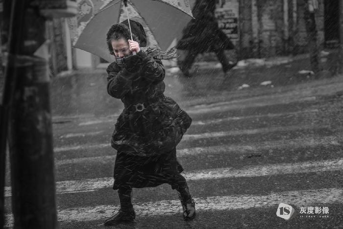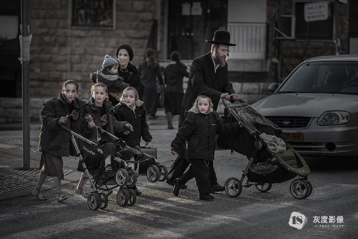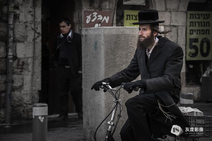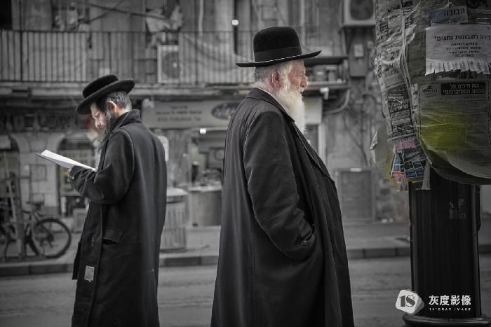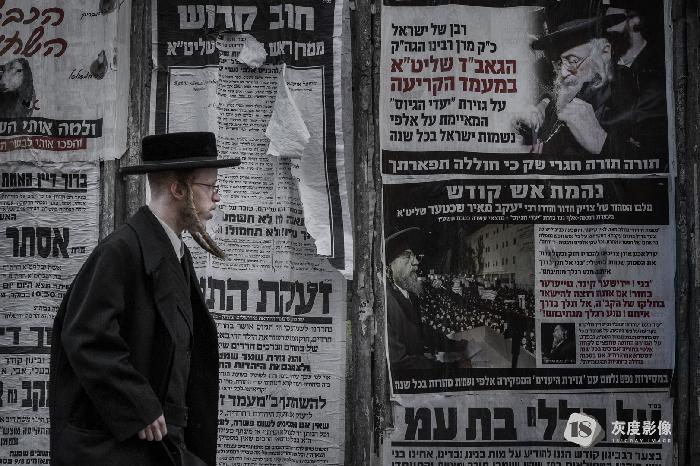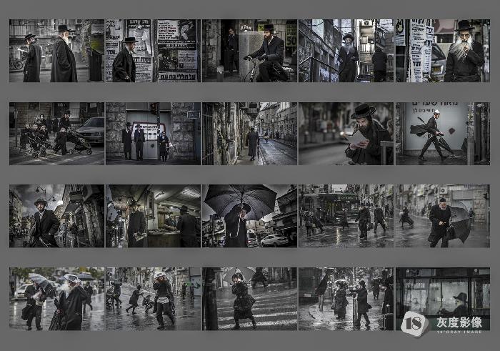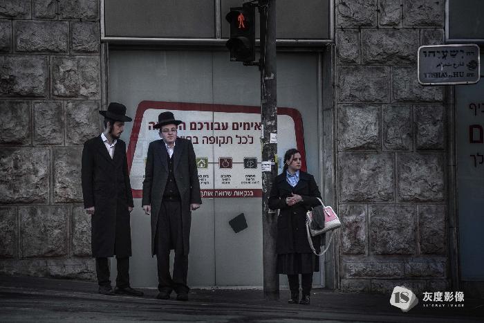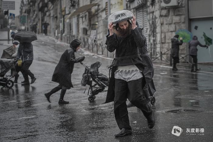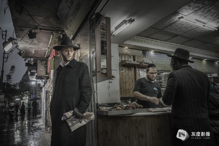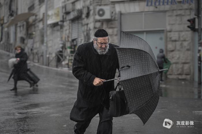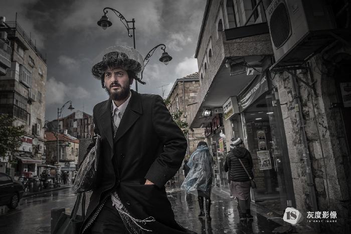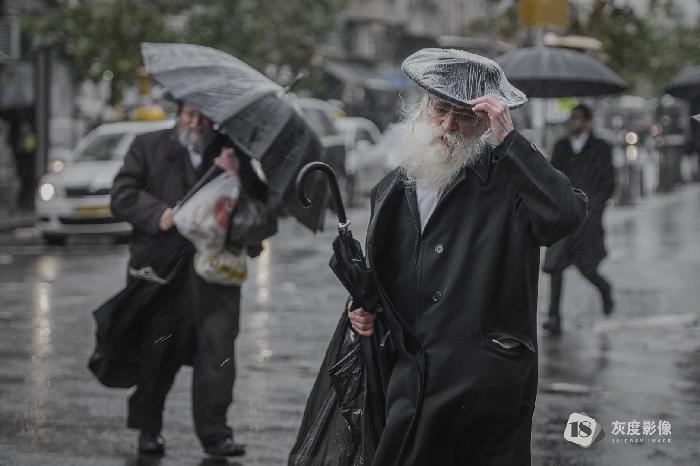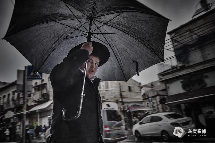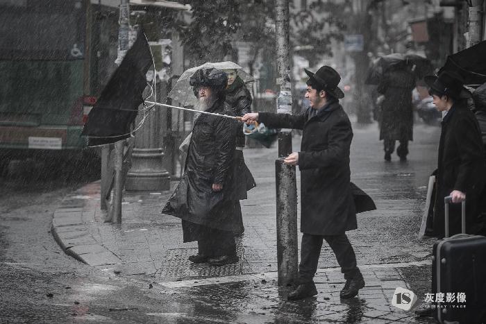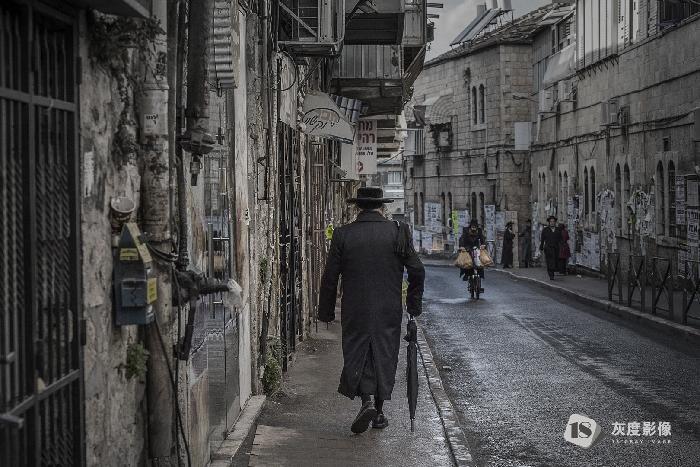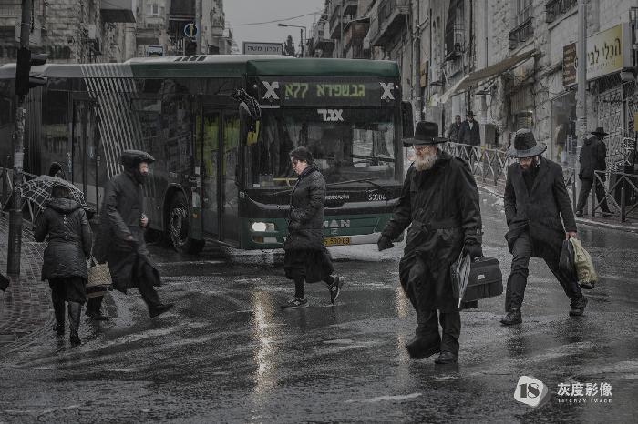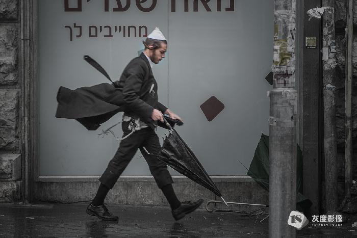陈欣欣在后期处理这组照片时,将色调调至近乎黑白,使画面给观者一种“黑云压城城欲摧”的感觉。低压的云层、突如其来的风雨,对比画面中犹太人那难望其项背的迅疾步伐、若有所思的严肃面容......像是山雨欲来,随时准备与新一轮的苦难抗争。